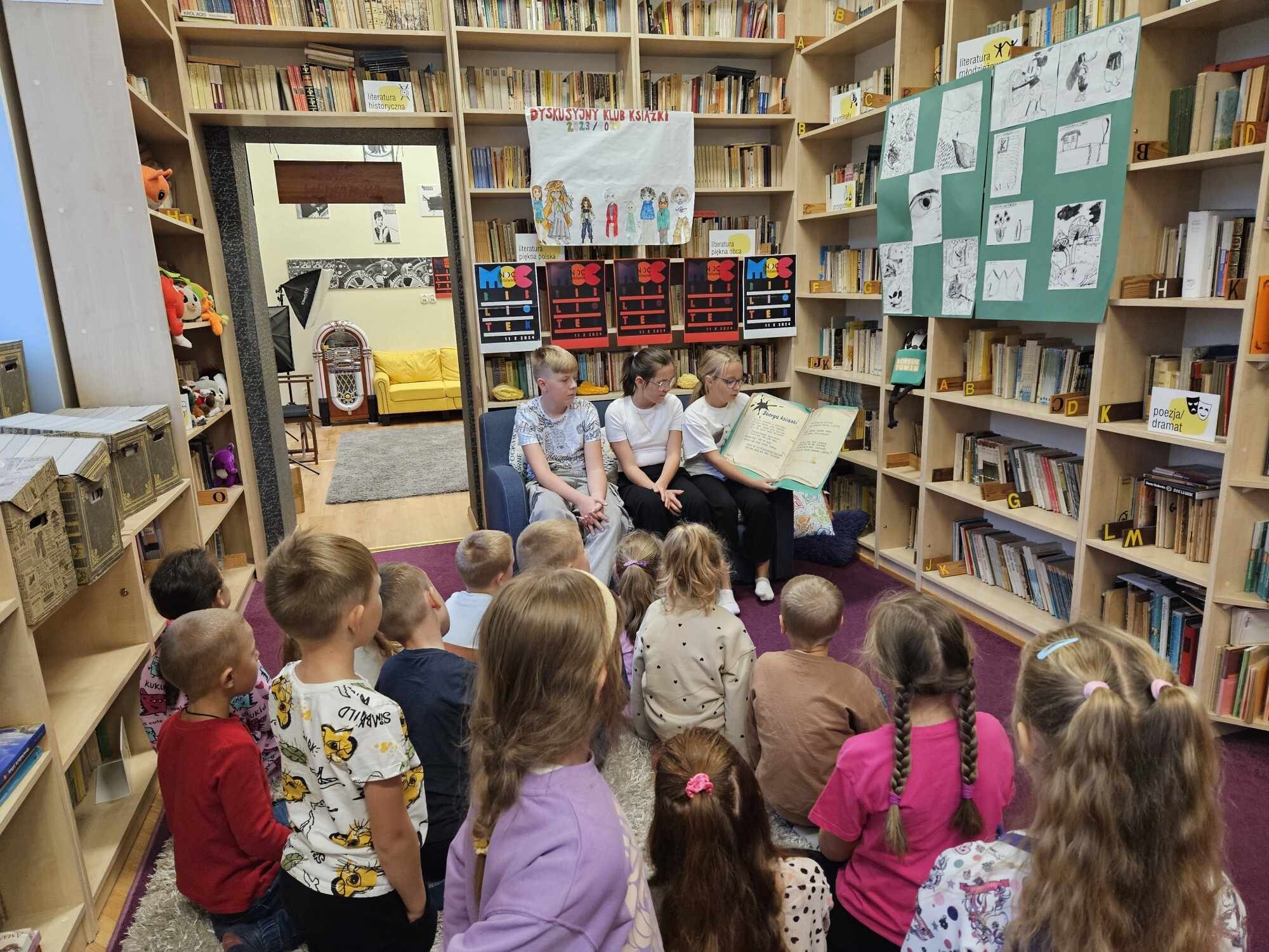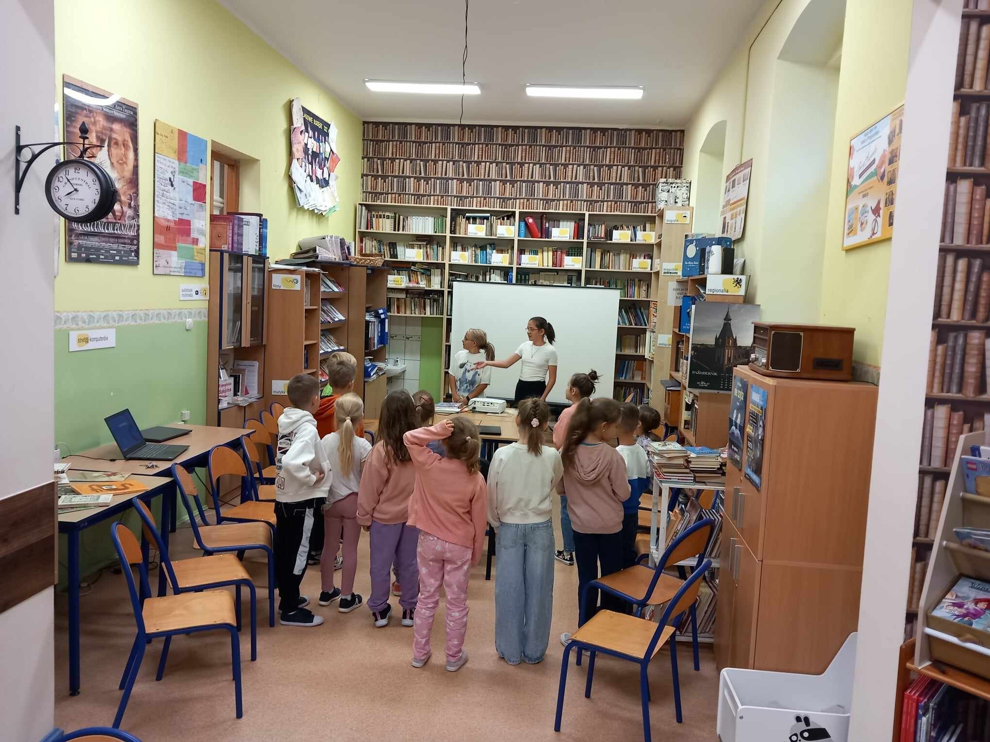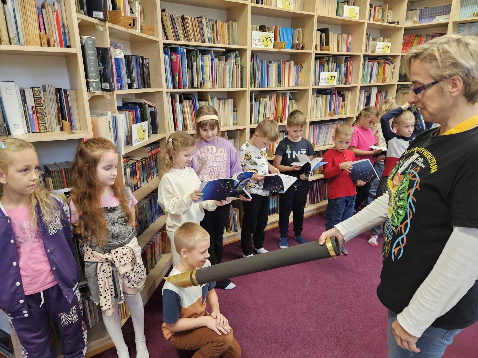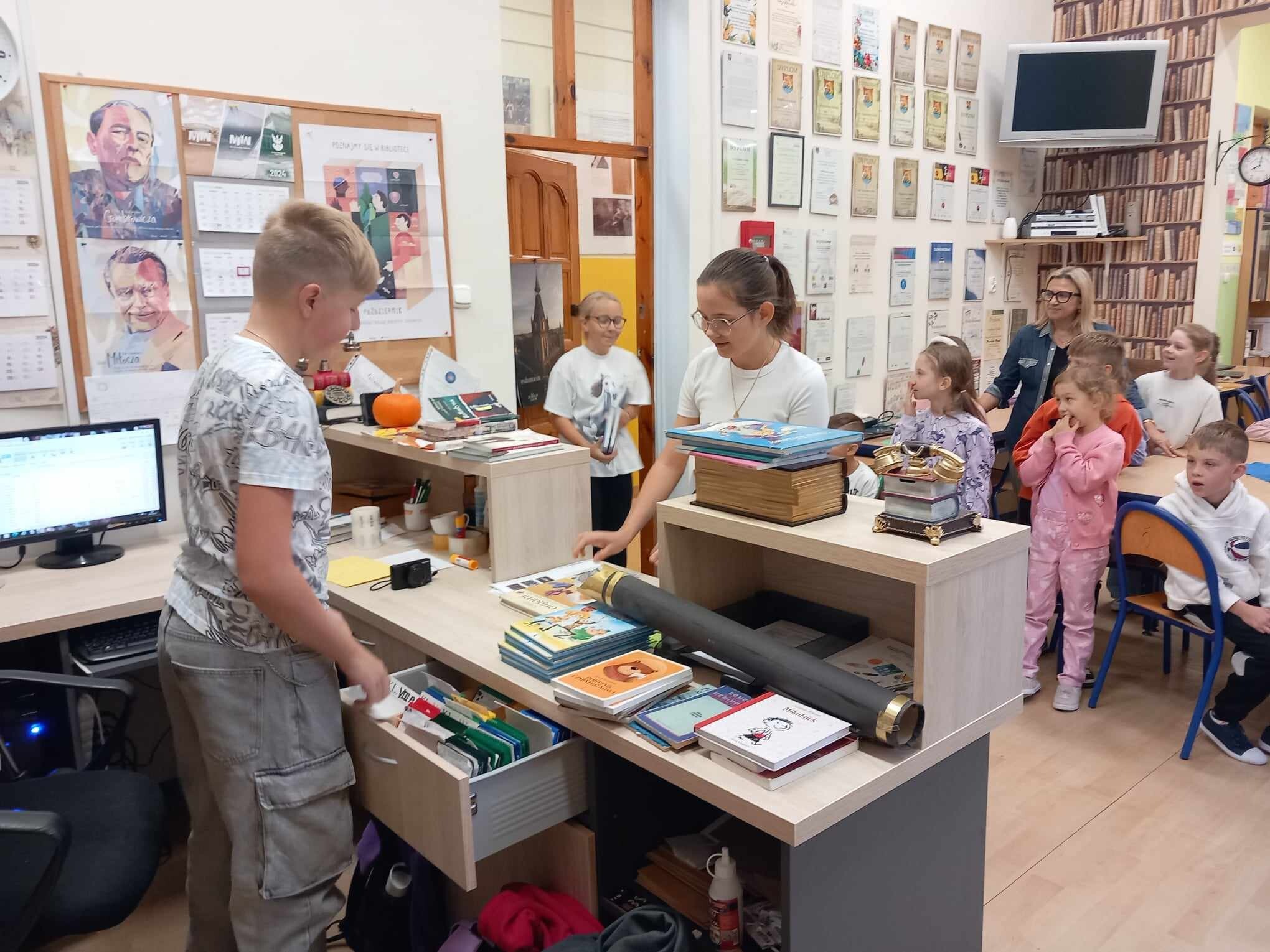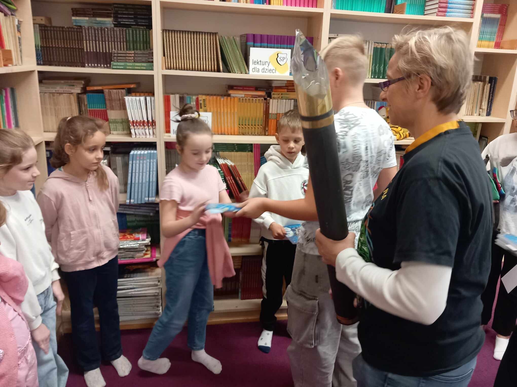 Ślubowanie uczniów klas pierwszych w październiku, czyli Międzynarodowym Miesiącu Bibliotek Szkolnych, to u nas już wieloletnia tradycja. Nie inaczej stało się również i w tym roku szkolnym. Pierwszaki zostały zaproszone na specjalnie dla nich przygotowane warsztatowe zajęcia czytelnicze w Bibliotece Szkolnej w Wicku, przygotowane przez czwórkę naszych uczniów z kl. VIA: Kingę Gołąbowicz, Lenę Stojek, Antoniego Szycę oraz Annę Wrońską.