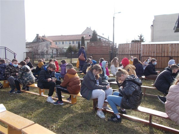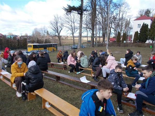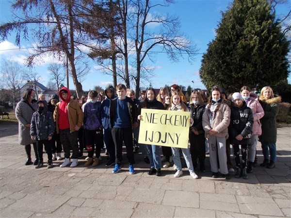 "Nie chcemy wojny" - tak brzmiało hasło przewodnie działań siódmoklasistów, którzy w poniedziałek, 3 marca 2022, zaakcentowali swój sprzeciw wobec agresji rosyjskich wojsk w Ukrainie podczas zajęć plenerowych, poświęconych patriotyzmowi i edukacji filozoficznej. Forma Socrates Café przyjęła się już w naszej szkole jako doskonały sposób na podejmowanie z młodzieżą nie tylko zagadnień związanych z filozofią, ale również na wspólną dyskusję o problemach w dzisiejszym, otaczającym nas świecie.