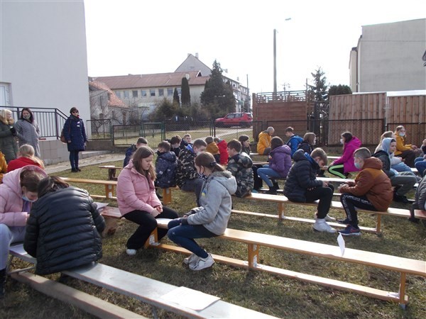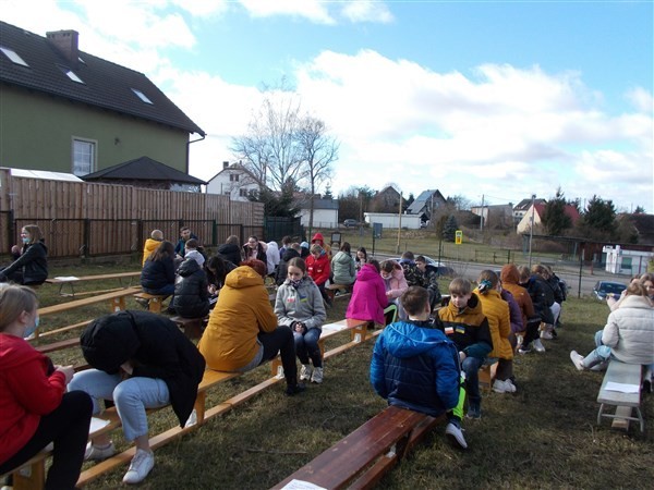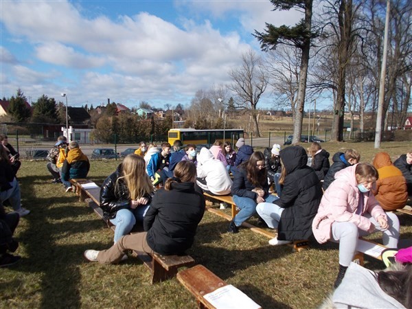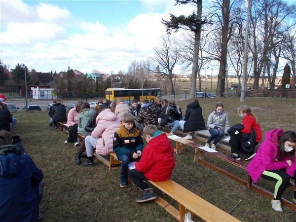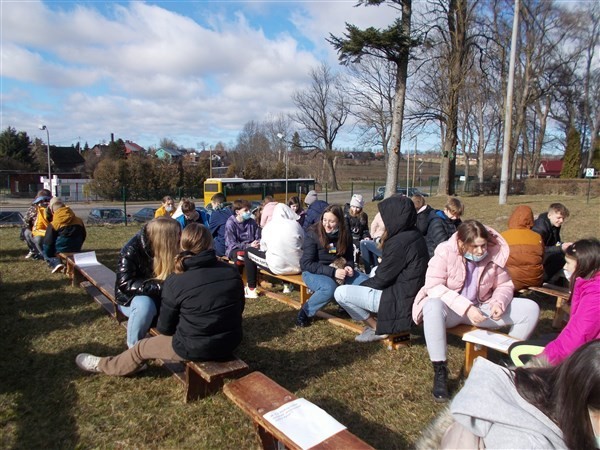 Słoneczna pogoda sprawiła, że wspólne zajęcia przedmiotów humanistycznych poruszające zagadnienia z podstawy programowej historii, wiedzy o społeczeństwie i języka polskiego, zostały przeniesione na skwer przed szkołą.