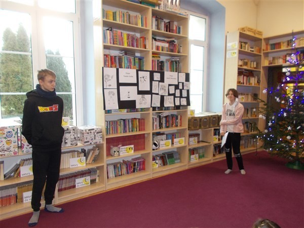Ponadto dwoje uczniów, Amelia Bikowska z kl. VA i Tomasz Goike z kl. VIIIB, z dumą zaprezentowało swoje prace plastyczne w stylu japońskich mang.