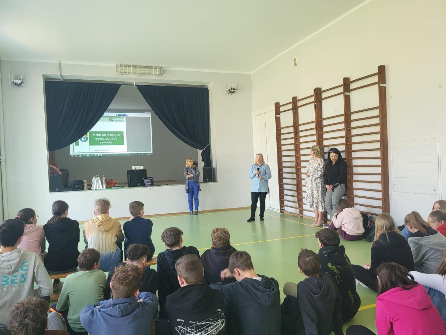 W czwartek, 20 kwietnia 2023, w malej sali gimnastycznej SP Wicko odbyło się spotkanie klas ósmych z przedstawicielami Powiatowego Urzędu Pracy.