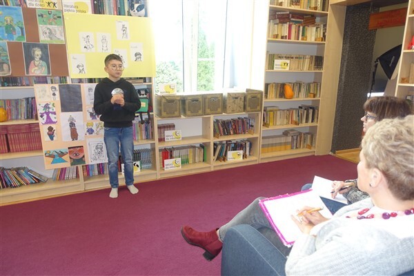 Ania i Miłosz zaprezentowali wojenne wiersze anonimowych autorów polskich, natomiast Maciej zmierzył się z klasycznym wierszem Juliana Tuwima "Do prostego człowieka". Jury w składzie: polonistki - Wioletta Barasińska i Dorota Halas oraz bibliotekarka szkolna - Magdalena Kubiak oceniały występy naszych uczniów według kryteriów regulaminu konkursowego. Brane były pod uwagę: