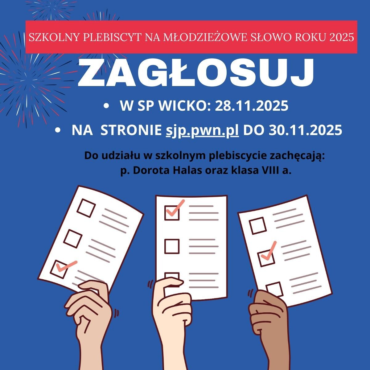 Jutro, tj. w piątek, 28 listopada, wybieramy najpopularniejsze w naszej szkole Młodzieżowe Słowo Roku 2025. Zachęcamy do głosowania.