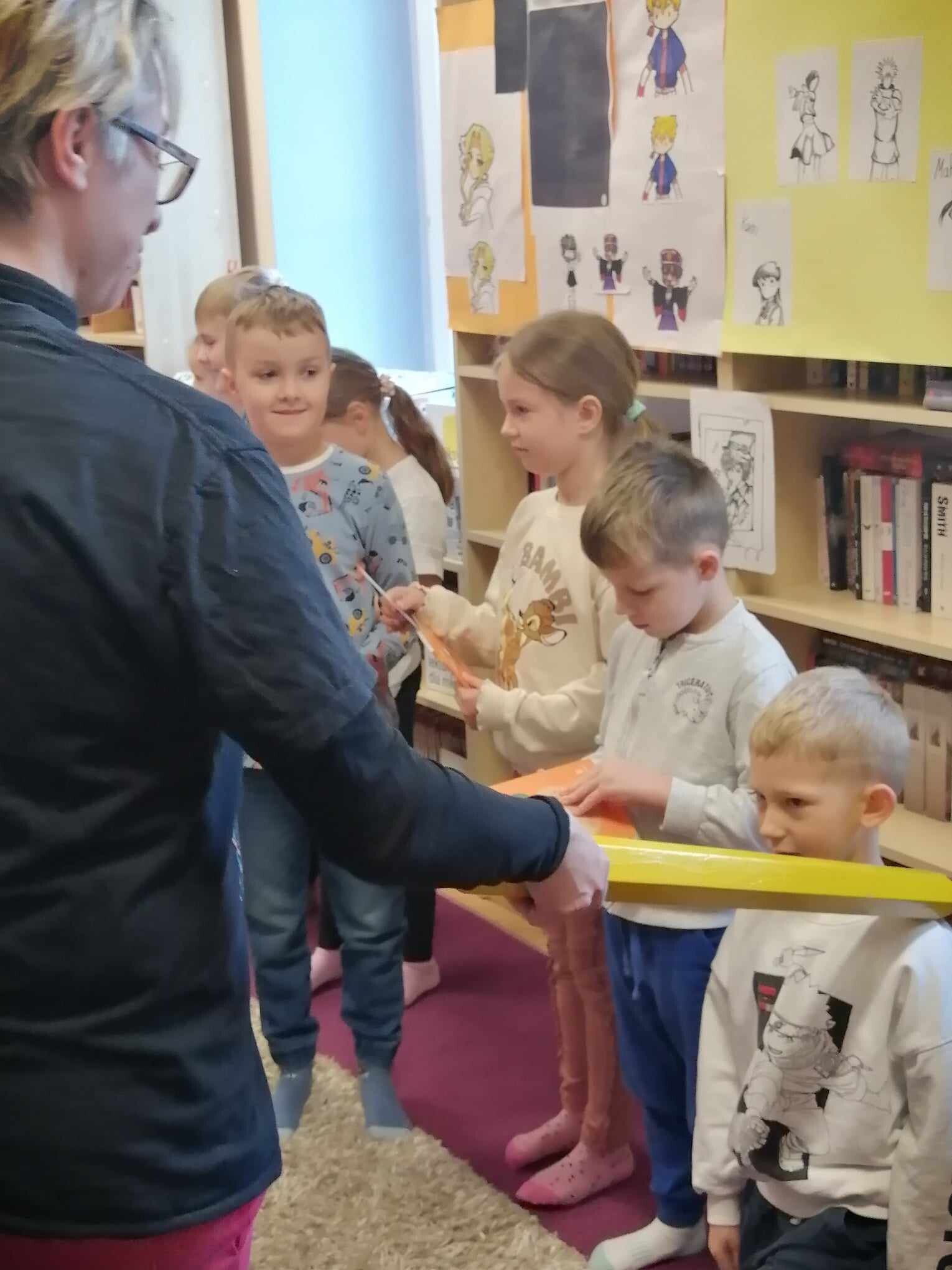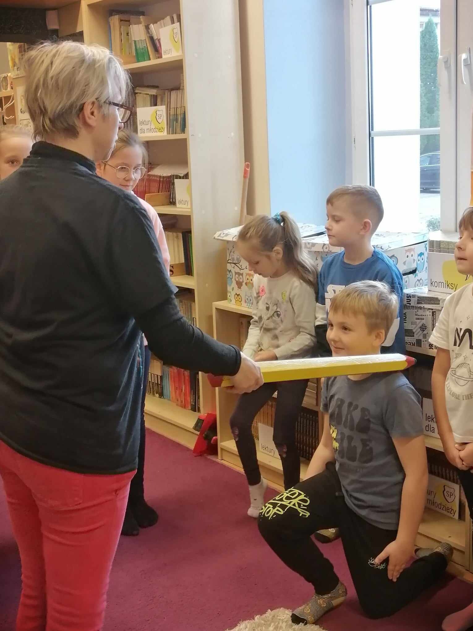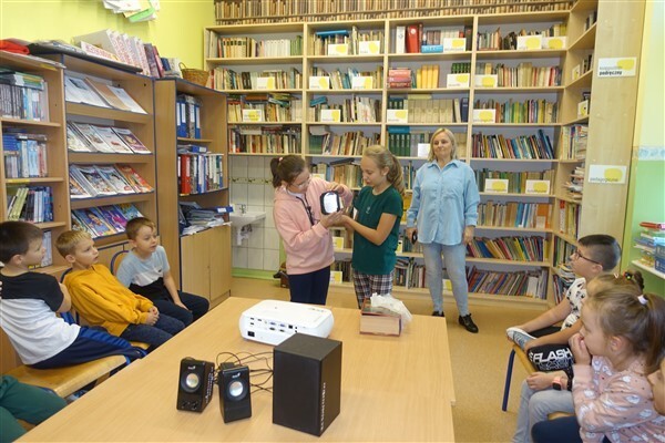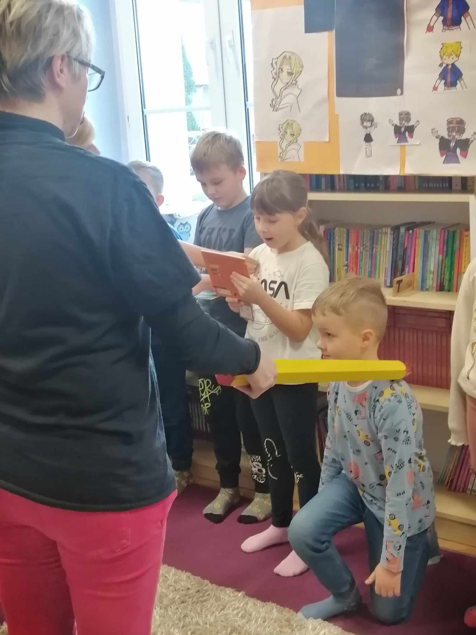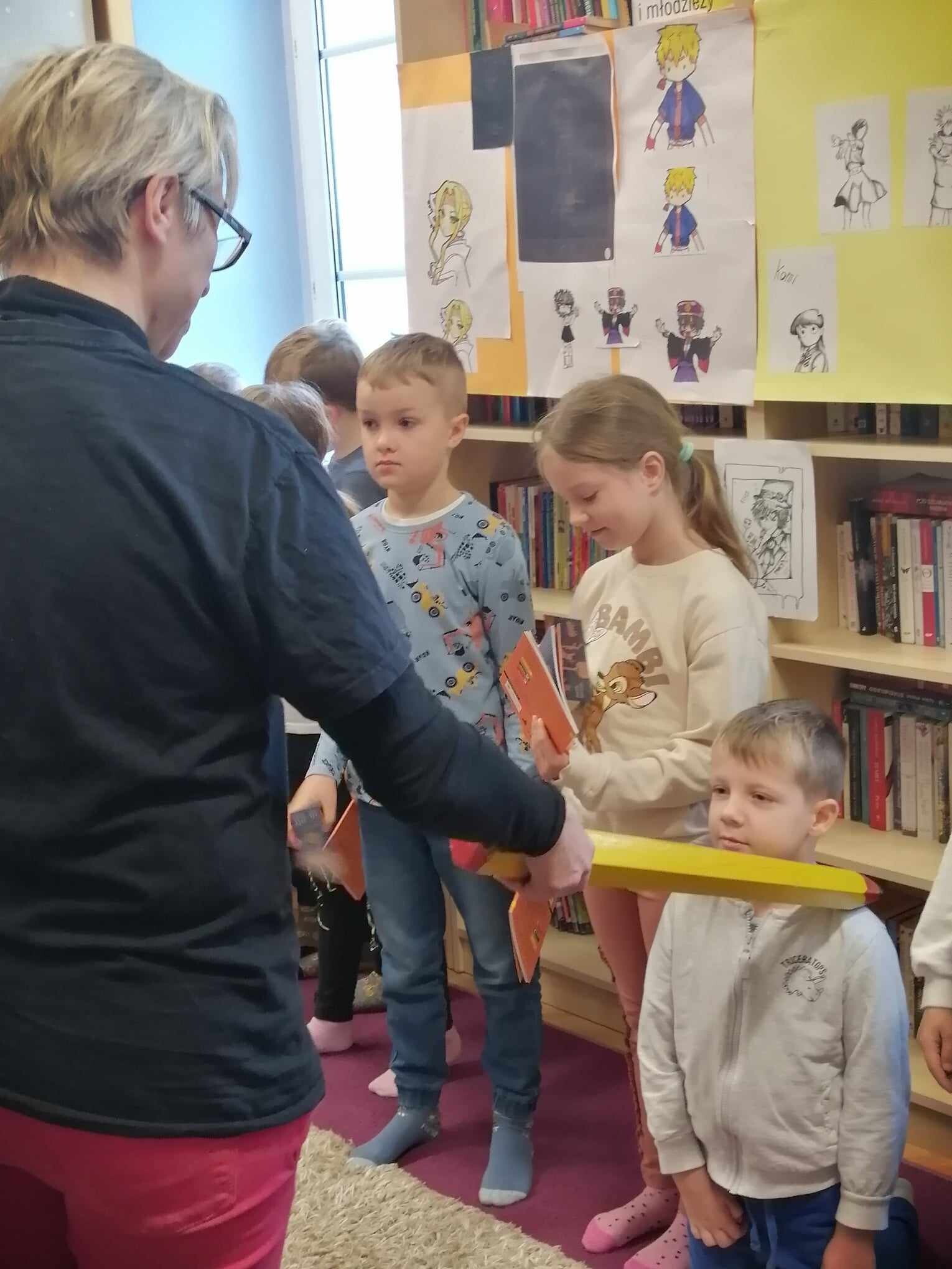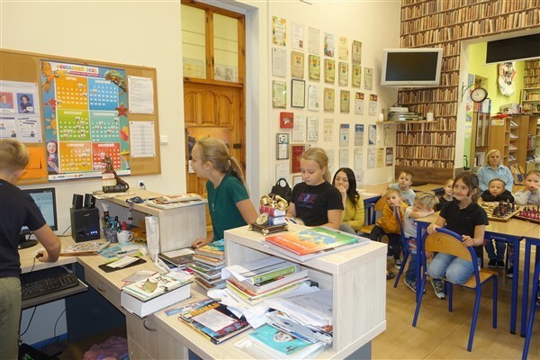Zanim jednak dzieci zostały pasowane na czytelników, musiały przejść szkolenie, jak powinny zachowywać się w bibliotece oraz w jaki sposób prawidłowo mogą samodzielnie korzystać z księgozbioru. A szkolenie czytelnicze przygotowali dla nich starsi uczniowie z kl. VA, należący do aktywu bibliotecznego: Kinga Gołąbowicz, Lena Stojek, Antoni Szyca i Anna Wrońska. Podczas prowadzonych samodzielnie zajęć pokazali pierwszakom krótkie inscenizowane scenki z życia biblioteki, tłumaczyli, jak prawidłowo wypożyczyć i oddać książkę do biblioteki, przestrzegali, co można, a czego nie należy robić w bibliotece, a także jak należy traktować nie tylko wypożyczone książki. Dzieciom w zwiedzaniu przestrzeni bibliotecznej towarzyszyła maskotka biblioteczna Borsuk Tomik.