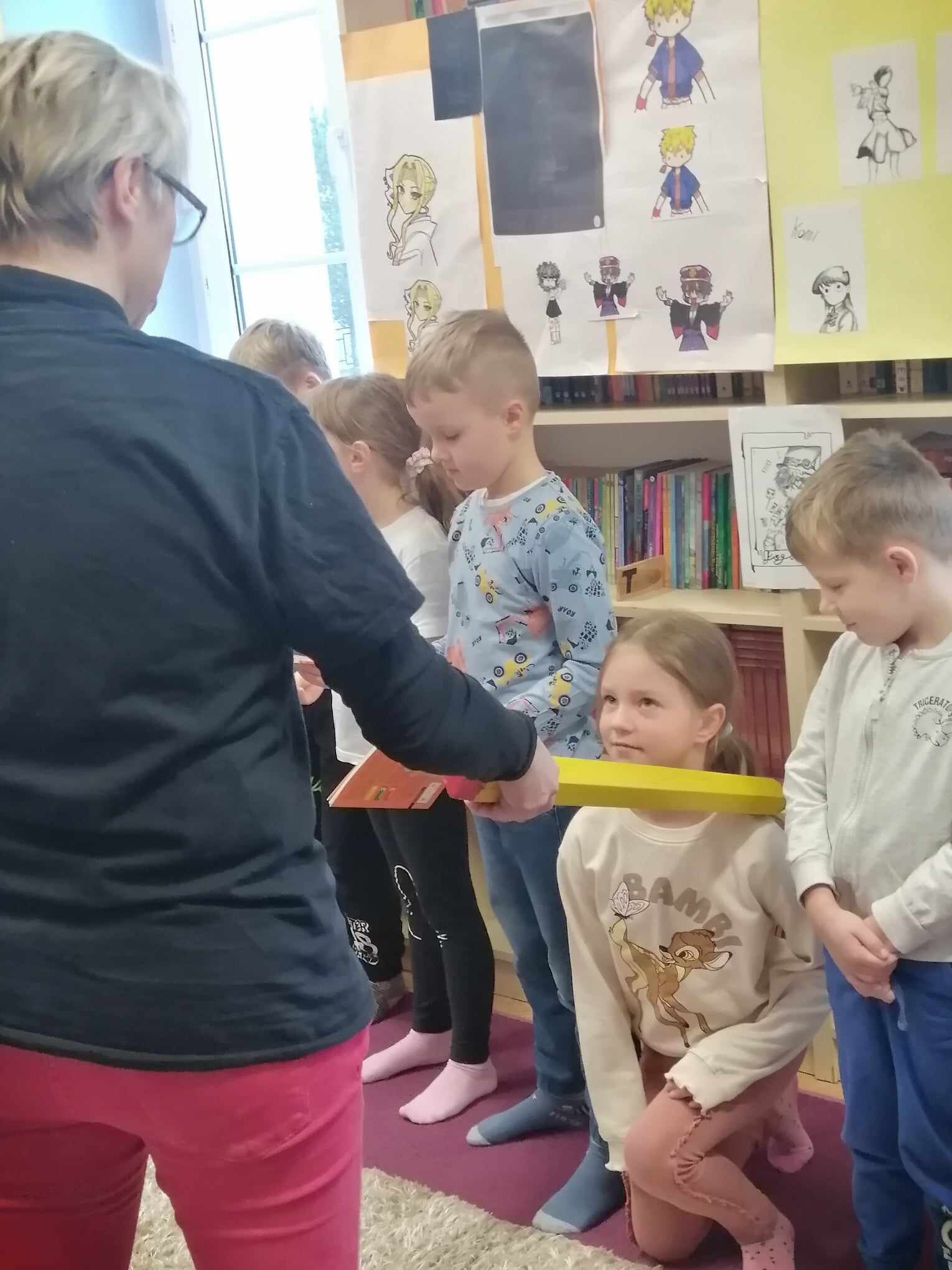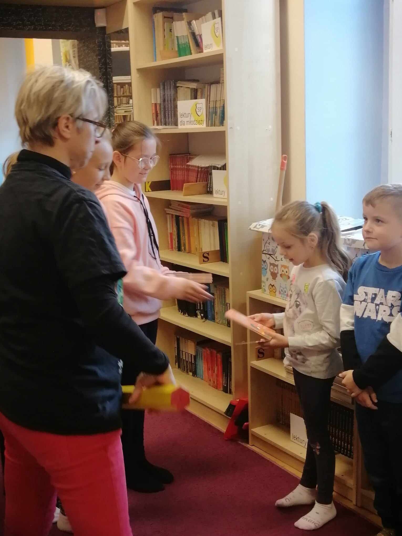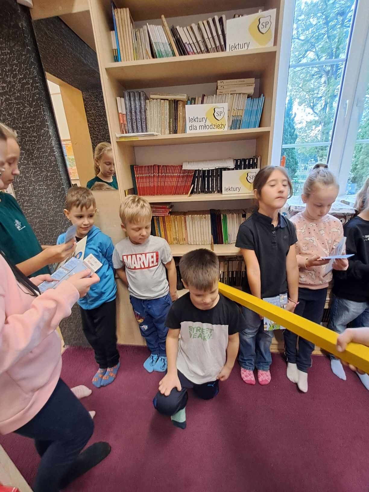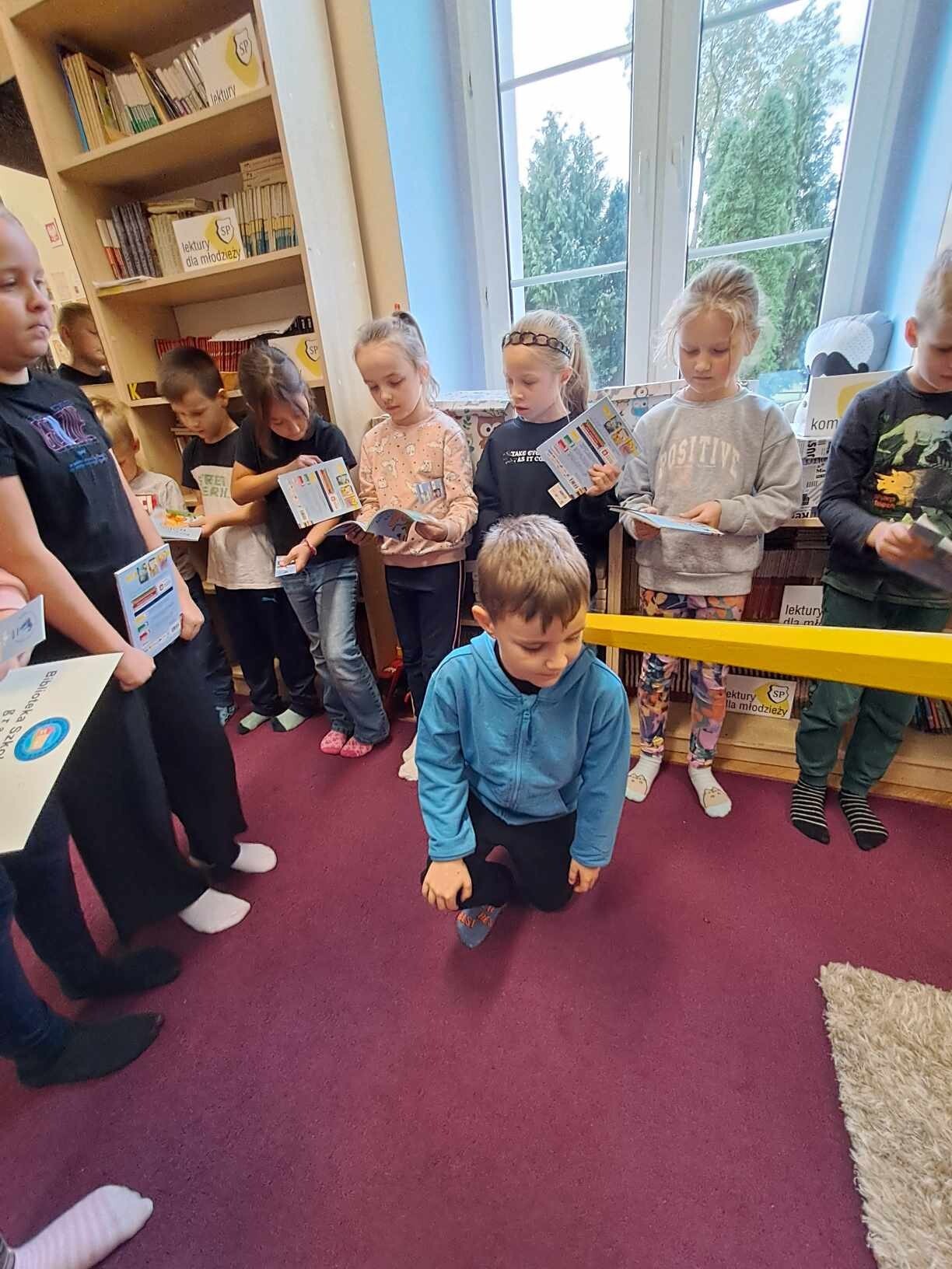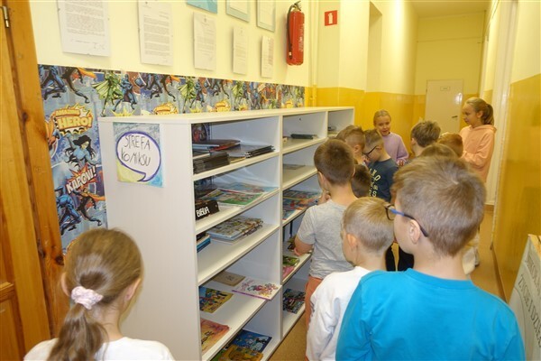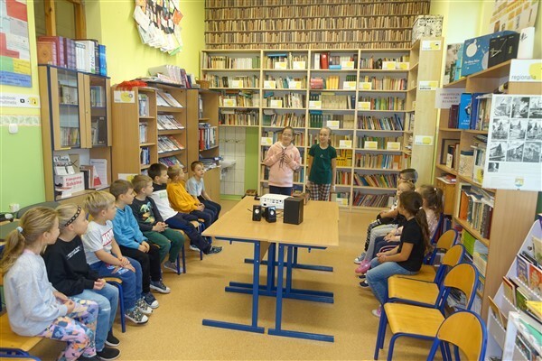 Zanim jednak dzieci zostały pasowane na czytelników, musiały przejść szkolenie, jak powinny zachowywać się w bibliotece oraz w jaki sposób prawidłowo mogą samodzielnie korzystać z księgozbioru. A szkolenie czytelnicze przygotowali dla nich starsi uczniowie z kl. VA, należący do aktywu bibliotecznego: Kinga Gołąbowicz, Lena Stojek, Antoni Szyca i Anna Wrońska. Podczas prowadzonych samodzielnie zajęć pokazali pierwszakom krótkie inscenizowane scenki z życia biblioteki, tłumaczyli, jak prawidłowo wypożyczyć i oddać książkę do biblioteki, przestrzegali, co można, a czego nie należy robić w bibliotece, a także jak należy traktować nie tylko wypożyczone książki. Dzieciom w zwiedzaniu przestrzeni bibliotecznej towarzyszyła maskotka biblioteczna Borsuk Tomik.