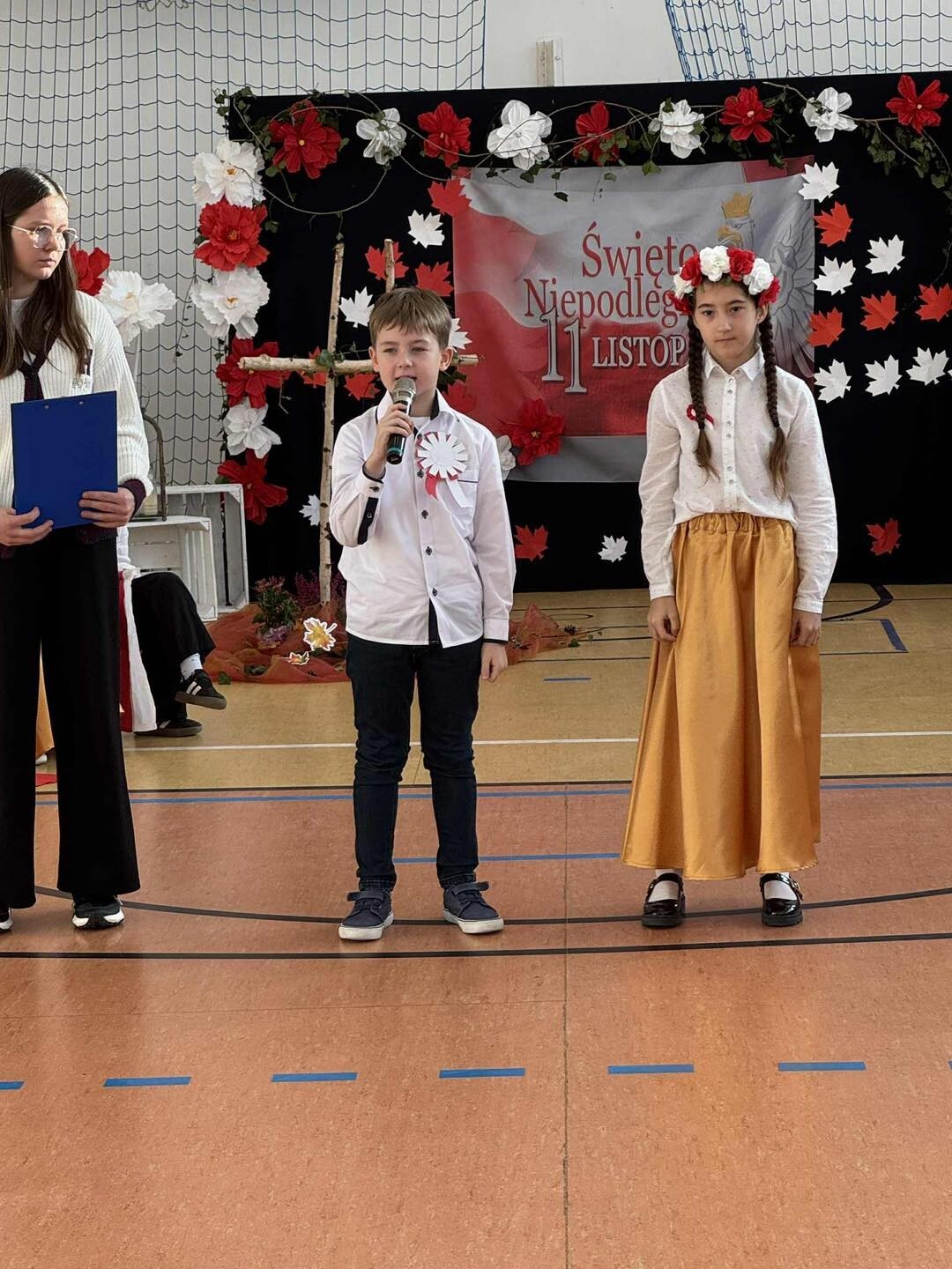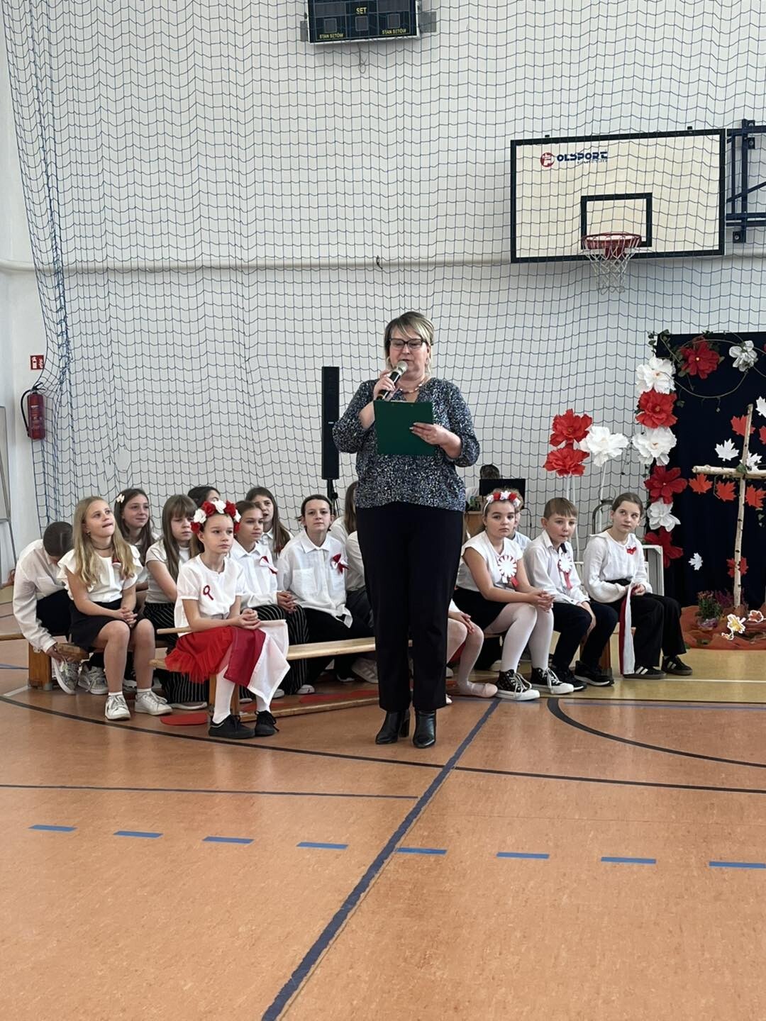 Chór uczniów klas piątych zaprezentował znane pieśni patriotyczne – „Wojenko, wojenko” oraz „Marsz I Brygady”, które z dumą i energią wybrzmiały na szkolnej scenie.