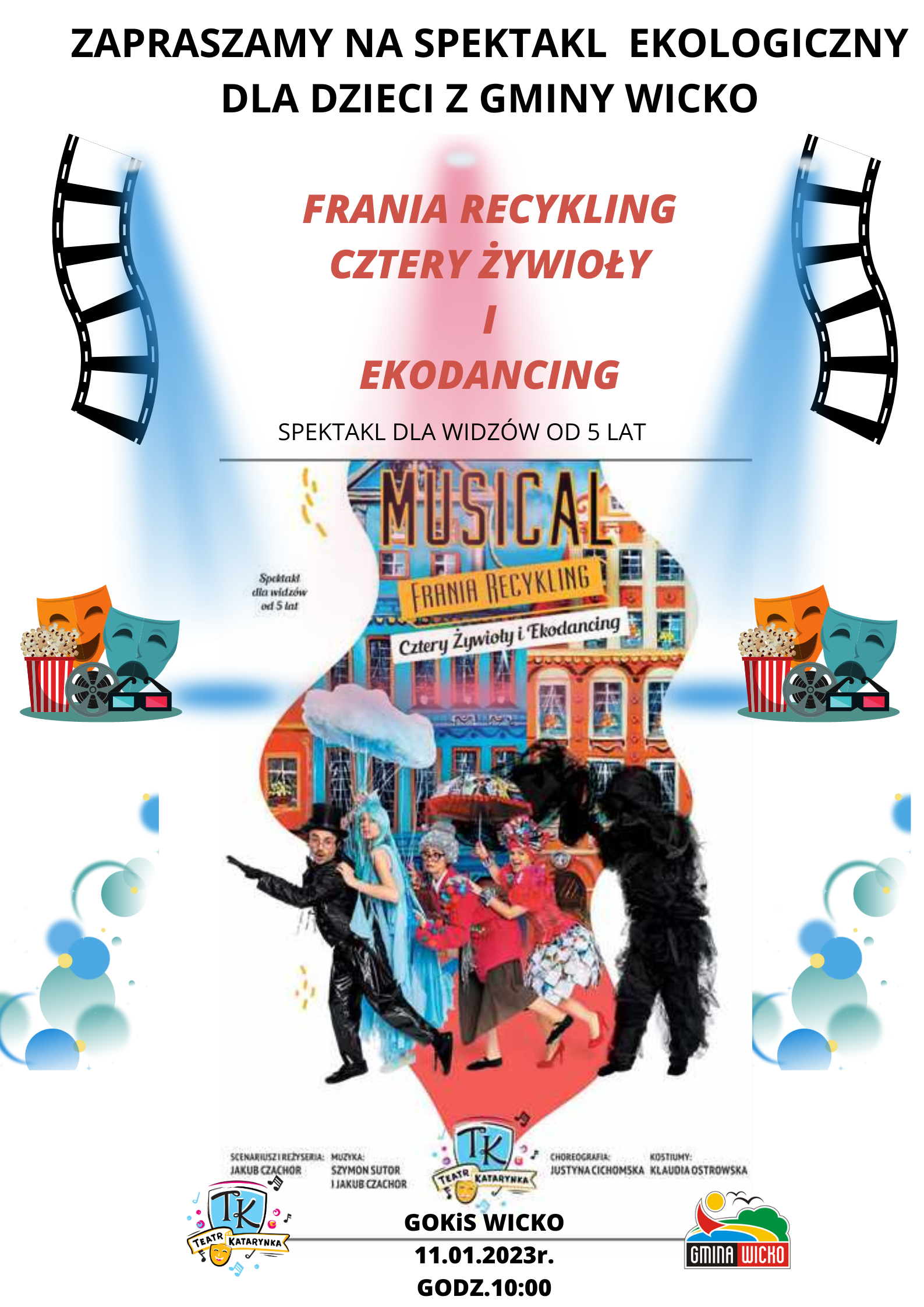 W środę, 11.01.2023, w GOKiS-ie w Wicku odbędzie się ekologiczny spektakl muzyczny pt. "Frania Recykling, cztery żywioły i ekodancing", który rozpoczyna się o godzinie 10:00. Uczniowie SP Wicko z klas I - V z nauczycielami w tym czasie prowadzącymi zajęcia oraz nauczycielami wspomagającymi wychodzą do GOKiS-u o godzinie 9:50. Opiekę nad uczniami podczas trwania spektaklu również sprawują nauczyciele, którzy w tym czasie mają w tych klasach zajęcia, a dyżury podczas przerw sprawują inni nauczyciele w zastępstwie.
