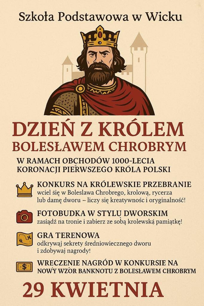 Już we wtorek, 29 kwietnia 2025 w Szkole Podstawowej w Wicku odbędzie się wyjątkowe wydarzenie – Dzień z Królem Bolesławem Chrobrym!