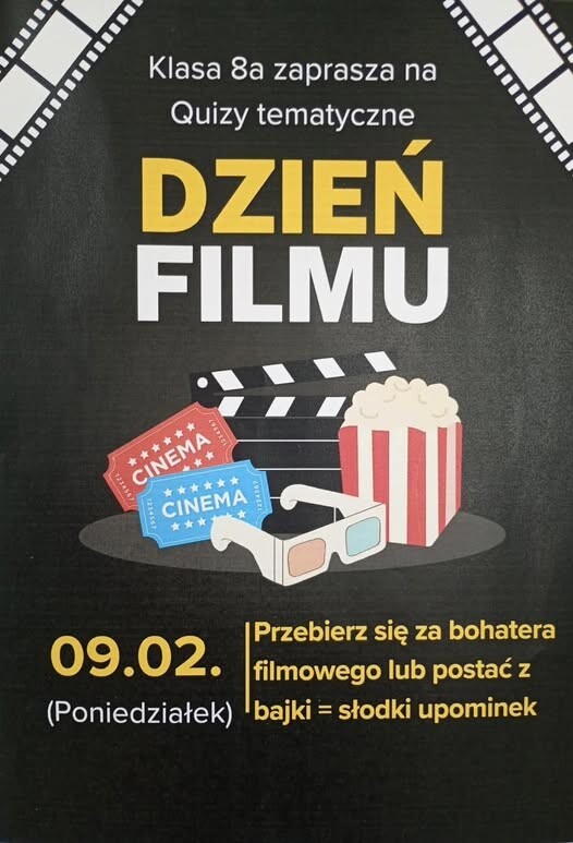 Klasa VIIIa zaprasza wszystkich uczniów do wspólnej zabawy z okazji Dnia Filmu, który odbędzie się w poniedziałek, 9 lutego 2026.