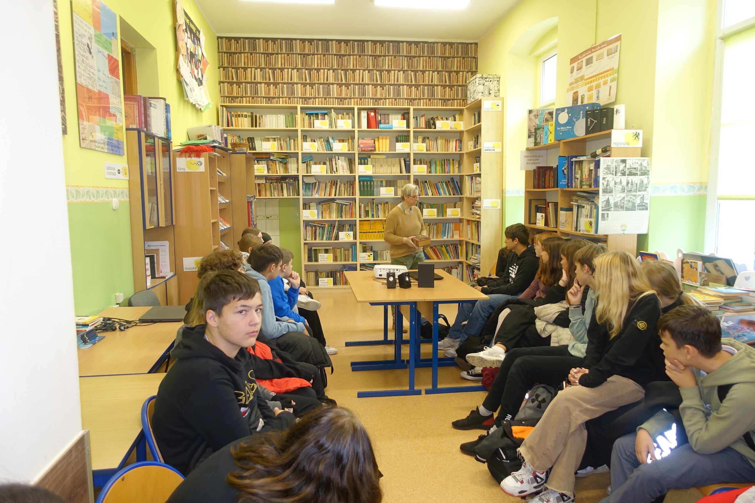 Podczas trwania Festiwalu Nauki w SP Wicko dla uczniów z trzech szkół z naszej gminy uczniowie kl. VII i VIII SP Szczenurze odwiedzili również Bibliotekę Szkolną w Wicku. Prócz zwiedzania wszystkich pomieszczeń: części multimedialnej z księgozbiorem najstarszych zasobów biblioteki, Narnii - wypożyczalni oraz zbiorów Mediateki, uczniowie mieli okazji skorzystać z omówienia ekspozycji na korytarzu bibliotecznym, poświęconej jednemu z patronów 2023 roku, Mikołajowi Kopernikowi. Plansze poglądowe podarowane nam z warszawskiego Archiwum Polskiej Akademii Nauk były drogowskazami dla młodzieży po niezwykłych losach Kopernika - czołowego przedstawiciela europejskiej elity intelektualnej czasów renesansu.