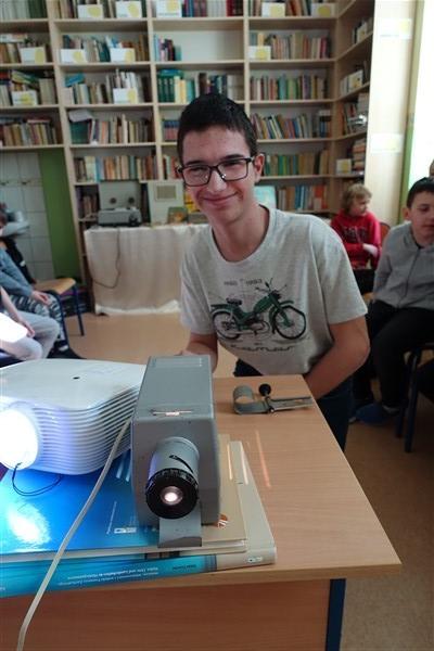 Drugoklasiści obejrzeli też fragment warszawskiej legendy „Złota kaczka” autorstwa Artura Oppmana „Or-Ota”, wyświetlanej na przeźroczach za pomocą projektora z lat 60. XX w.