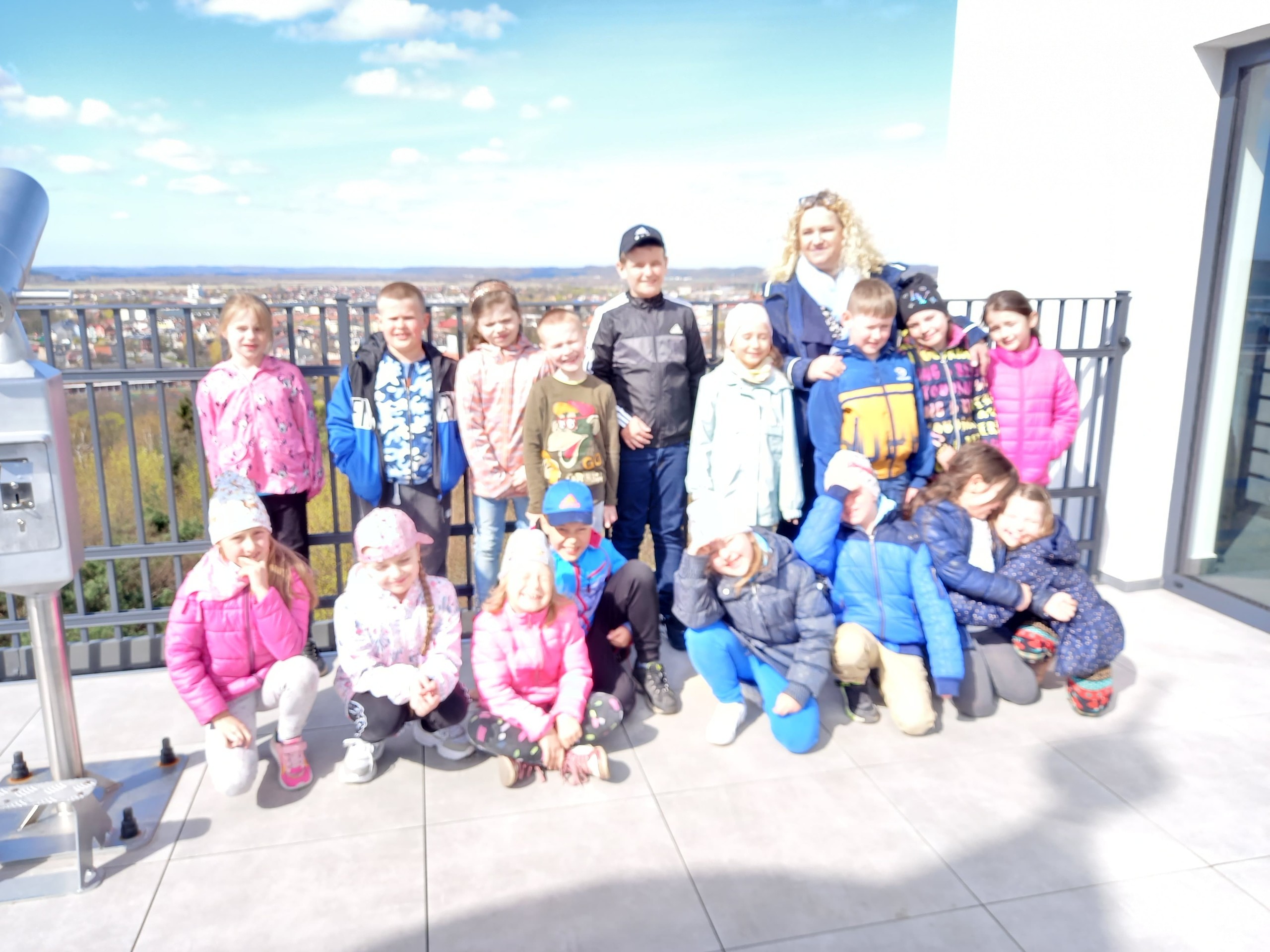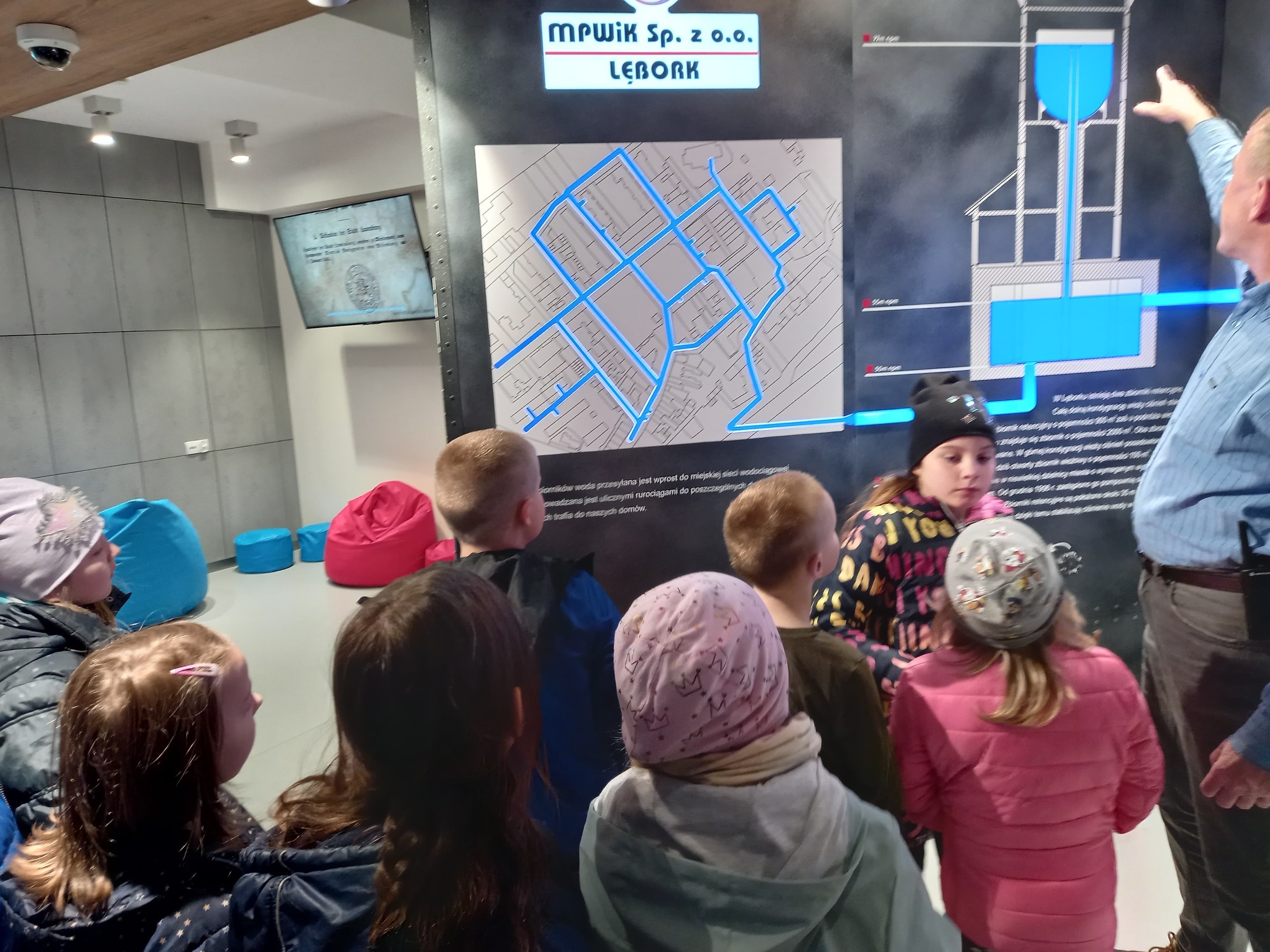 Następnie udaliśmy się do Wieży Ciśnień. Dzieci mogły usłyszeć od przewodnika krótką historię wieży, dowiedziały się o jej przeznaczeniu oraz prześledziły schematy działania sieci wodociągowej. Dużą atrakcją dla wszystkich były zajęcia z nowoczesnym skanerem oraz możliwość wirtualnego poszukiwania skarbów. Mogliśmy również podziwiać panoramę miasta z tarasu wieży.
