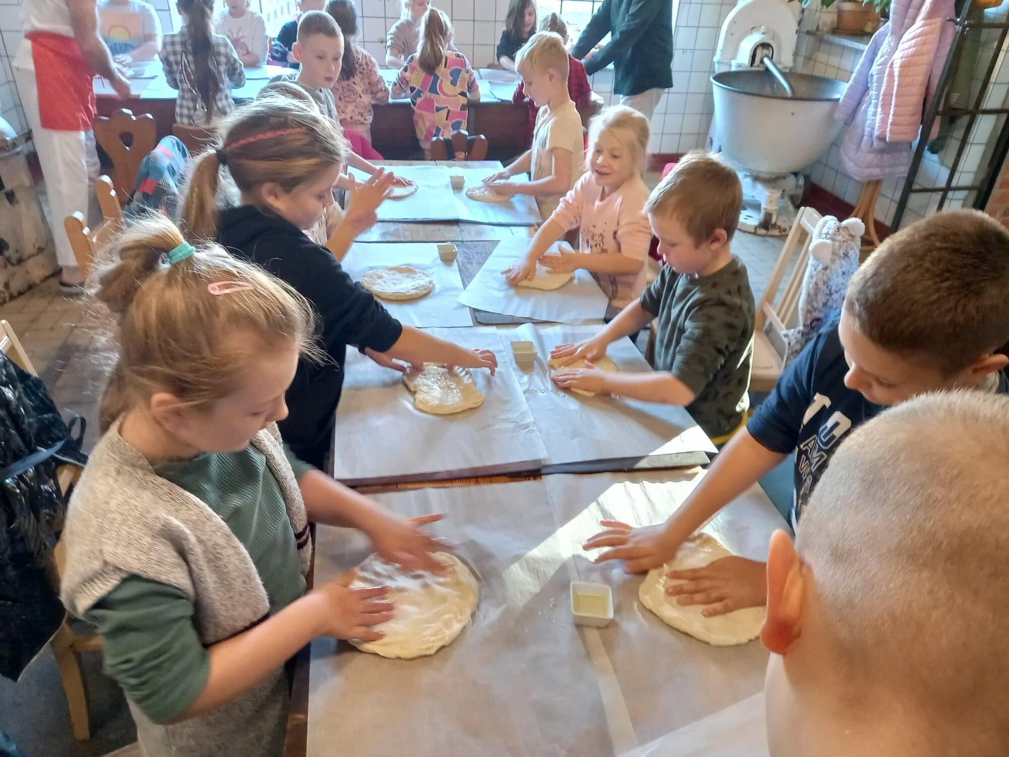 W dniu dzisiejszym (20.10.2022) uczniowie klasy IIA wybrali się na wycieczkę do Łeby, do Manufaktury - Piekarni Płotka. Zapoznali się z pracą piekarza. Dzieci zobaczyły sprzęt wykorzystywany w piekarni, zwłaszcza ten, który służył piekarzom kilkadziesiąt lat temu. Wysłuchały opowieści gospodarza piekarni o jego pracy oraz samodzielnie mogły doświadczyć ugniatania czy zaplatania ciasta, tworząc różne wypieki. Najwięcej emocji przysporzyło jednak własnoręczne wykonanie pizzy z ulubionymi dodatkami, którą każdy z apetytem na koniec skonsumował.