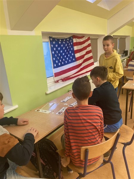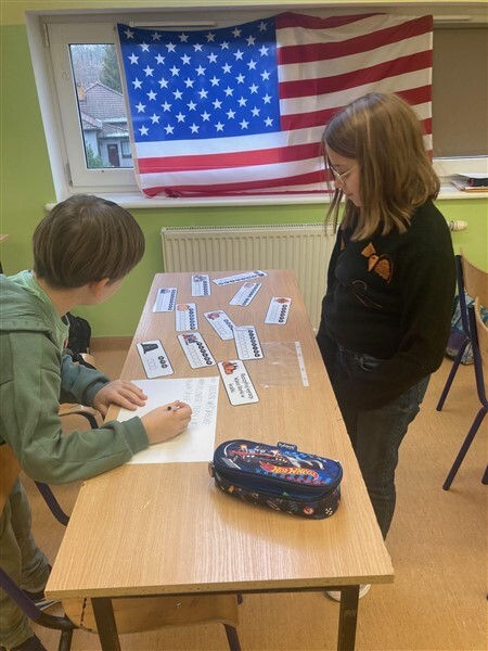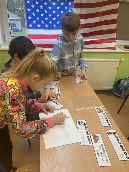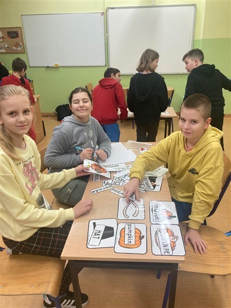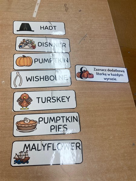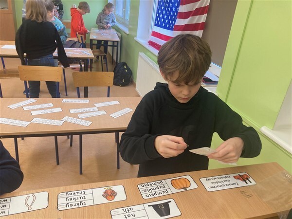 Uczniowie klas młodszych zostali wprowadzeni w tematykę święta, dzięki bajce o Thanksgiving. Następnie pracowali w grupach metodą stacji, wykonując wspólnie zadania, których celem było poznanie i utrwalenie słownictwa związanego z tematem lekcji. Wspólnie układali domino, łączyli połówki słówek czy uzupełniali słowa brakującymi literkami.