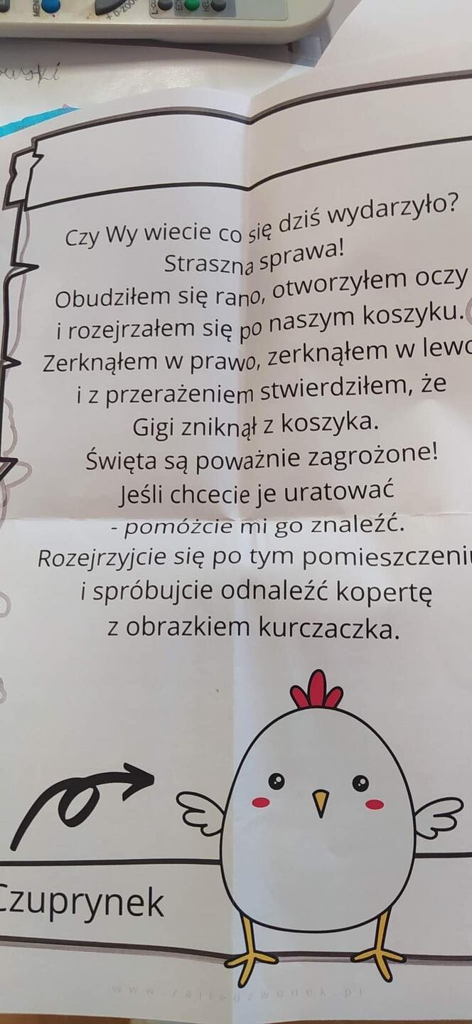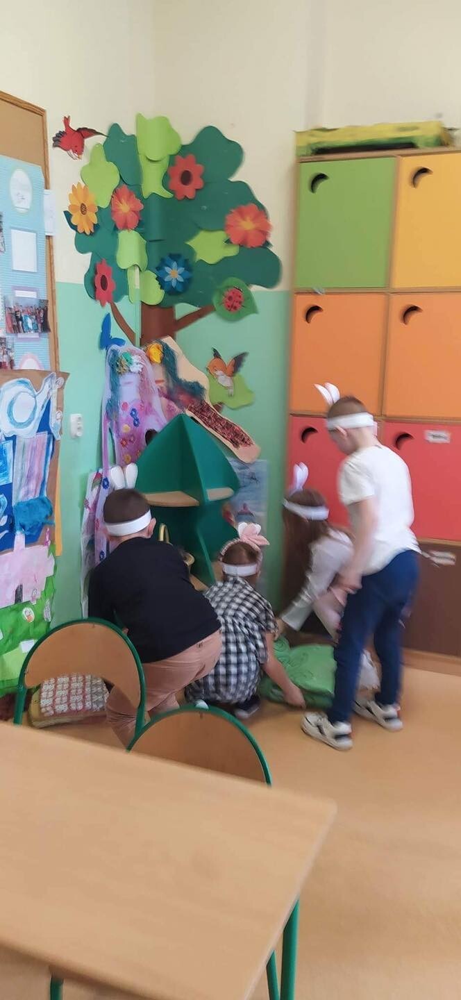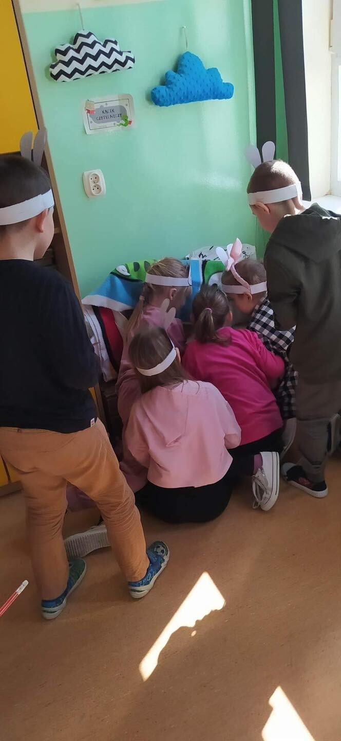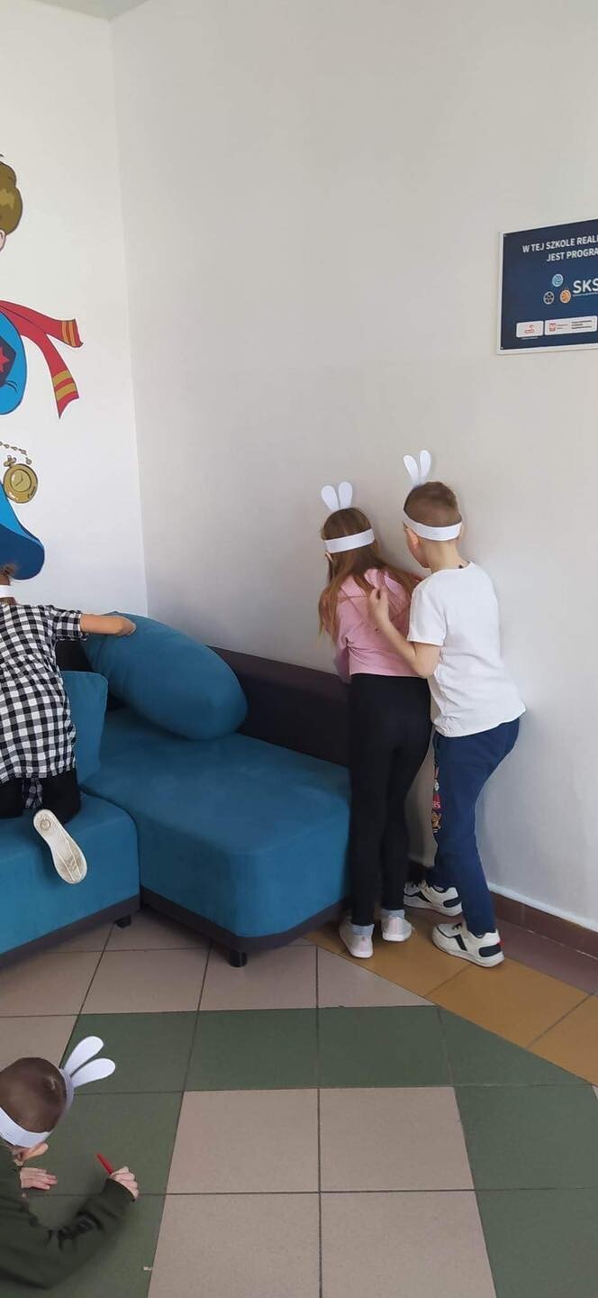 Pierwszaki w ostatni dzień przed świętami stanęły przed ciekawym zadaniem. Schował się przed nimi zajączek Gigi i ukrył świąteczne upominki. Dzieci musiały odwiedzić kilka miejsc w szkole i rozwiązać przygotowane zagadki, które na koniec doprowadziły ich do wielkanocnych upominków. Było mnóstwo emocji i radości.
