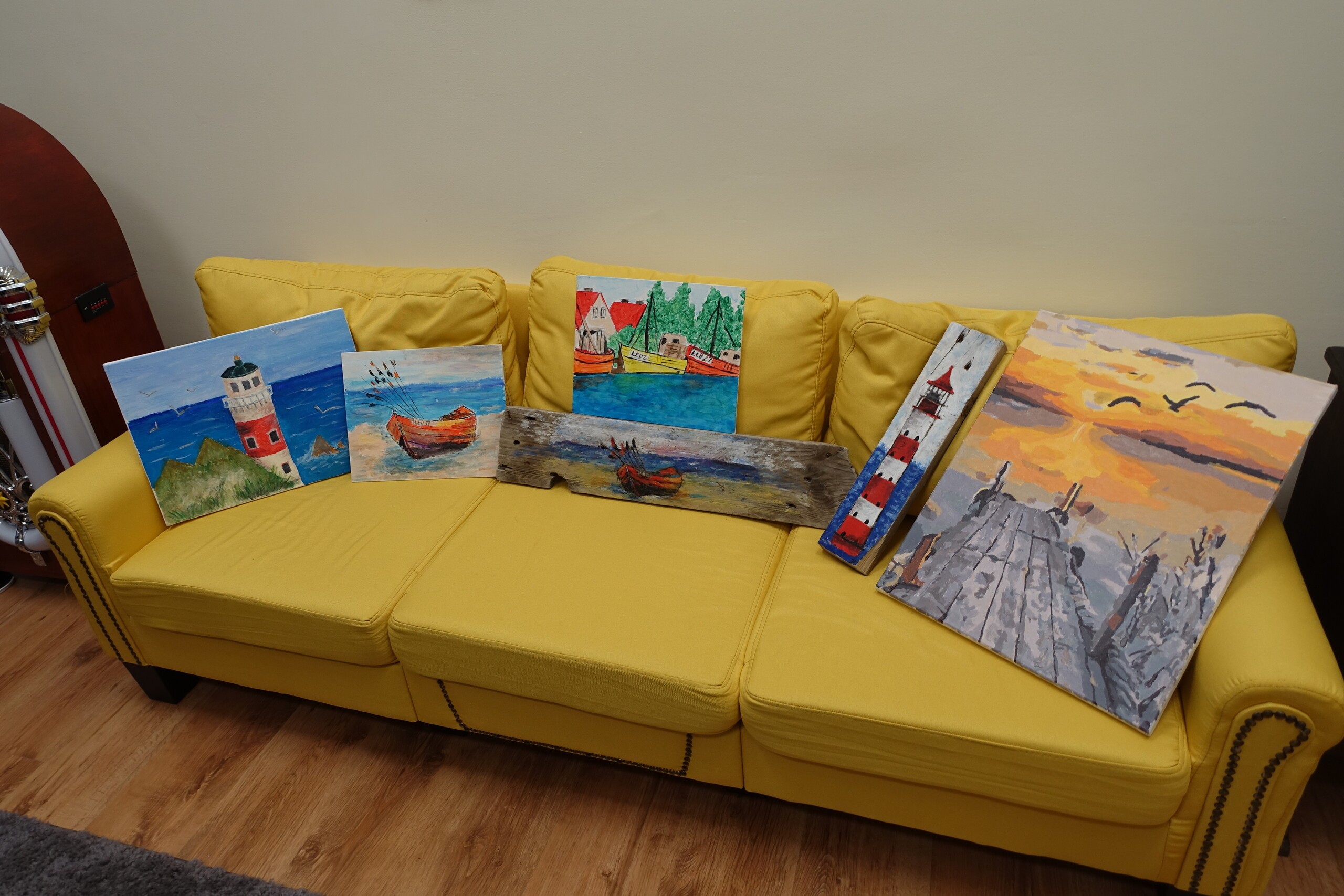 Dodatkową atrakcją zajęć o pomorskich legendach było zwiedzanie w Mediatece ekspozycji prac plastycznych nauczycielki piątoklasistów, Pani Joanny Jagodzińskiej, która od wielu lat tworzy prace plastyczne, inspirowane pomorskim krajobrazem. Często są to obrazy namalowane na rzeczach wyrzuconych przez morze - kawałkach drewna i desek. W ten ujmujący prostotą sposób autorka wyraża swój emocjonalny związek z regionem Morza Bałtyckiego. Gratulujemy talentu i czekamy na wernisaż!