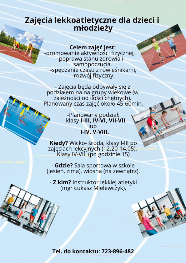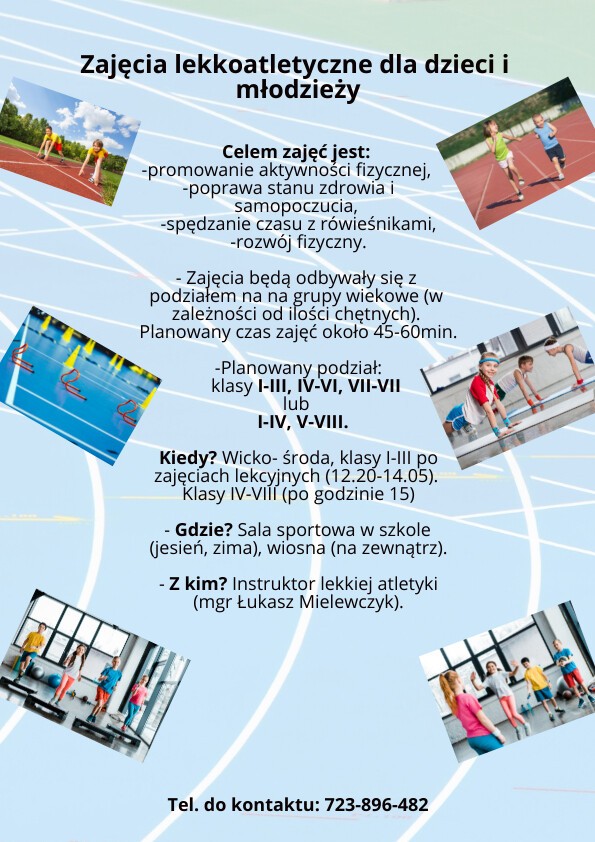 W związku z licznymi zapytaniami od rodziców, odnośnie zajęć z lekkiej atletyki postanowiliśmy, że pierwsze spotkanie organizacyjne odbędzie się w najbliższą środę (21.09) o godzinie 15.00 na dużej sali gimnastycznej w naszej szkole. Zostaną omówione szczegóły związane z zajęciami, będzie można zadać pytania oraz tego dnia też zostaną zebrane zgody od rodziców. Wzór zgód znajduje się w sekretariacie naszej szkoły. W razie pytań prosimy o kontakt z organizatorem Panem Łukaszem Mielewczykiem: tel. 723 896 482