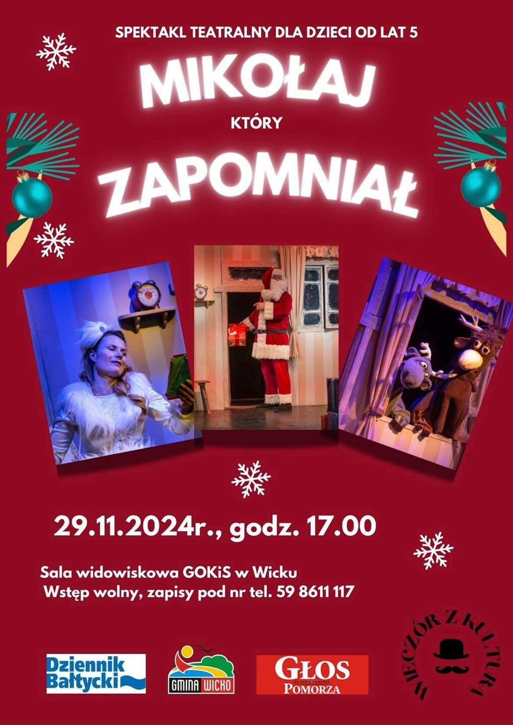 W ramach cyklu "Wieczór z kulturą" dla dzieci z terenu Gminy Wicko 29 listopada 2024 o godz. 17.00 w sali widowiskowej GOKiS-u w Wicku pokazany zostanie spektakl teatralny. Widowisko przeznaczone jest dla dzieci od 5. roku życia. Zapisy w GOKiS-ie w Wicku, tel. 59 861 11 17, w godzinach 8.00-16.00. Liczba miejsc ograniczona.