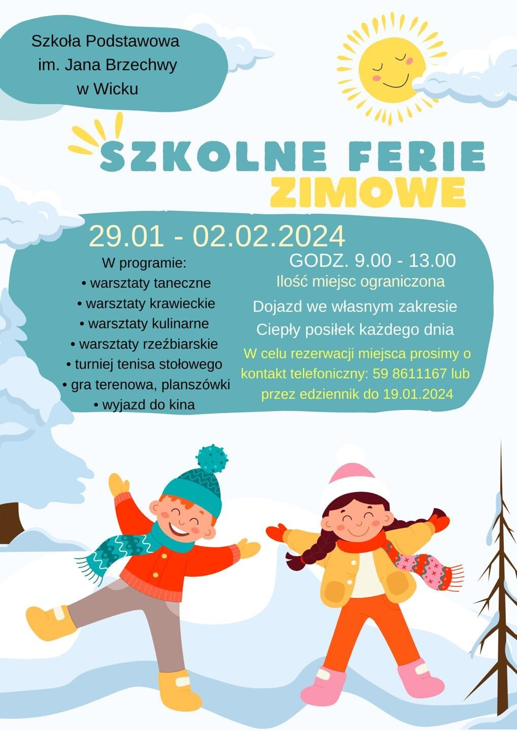W pierwszym tygodniu ferii zimowych (29.01-02.02) zapraszamy uczniów na półkolonie organizowane w naszej szkole.