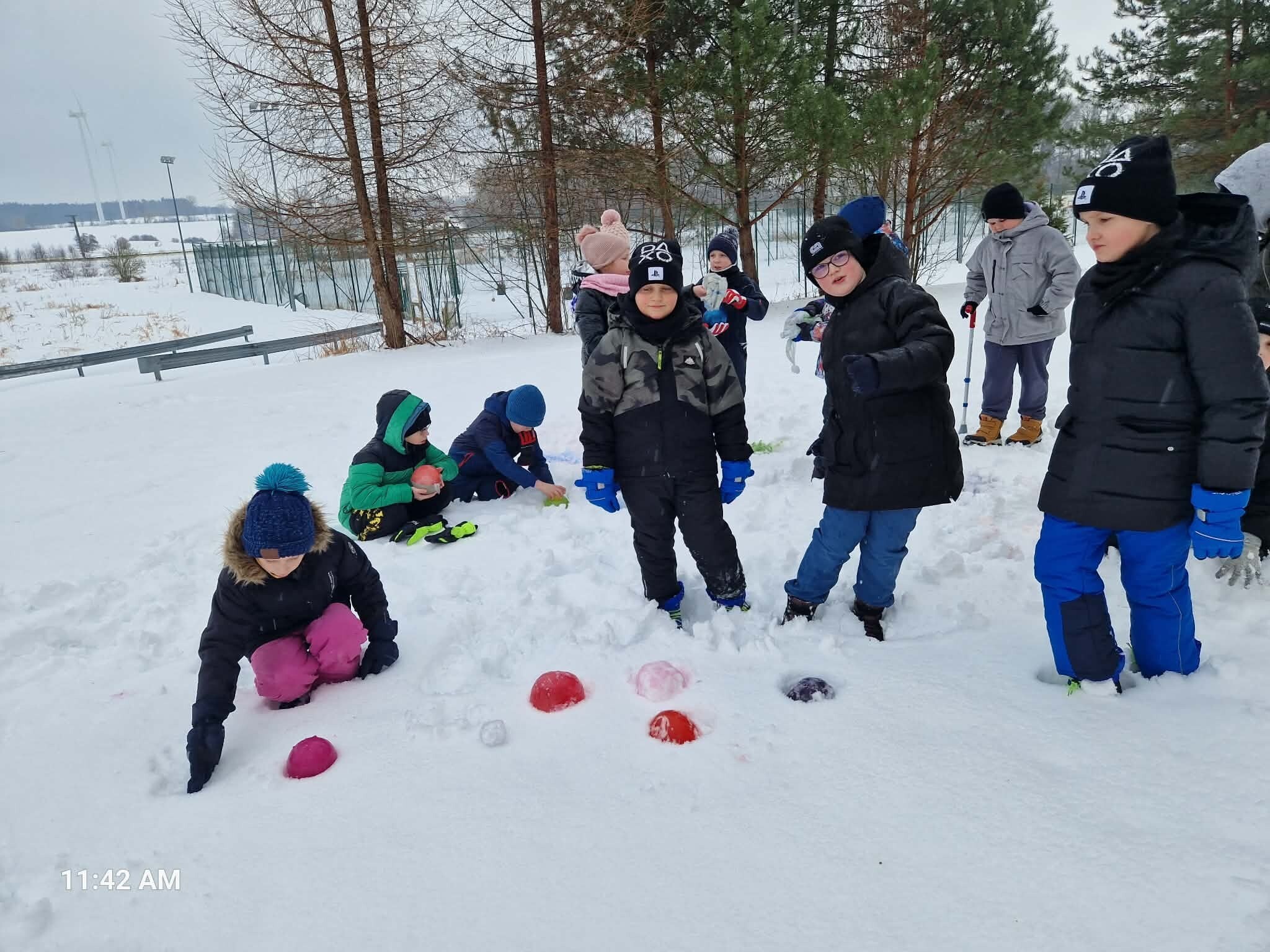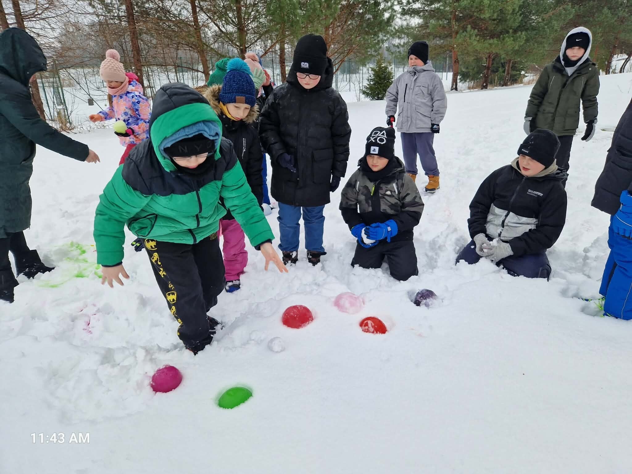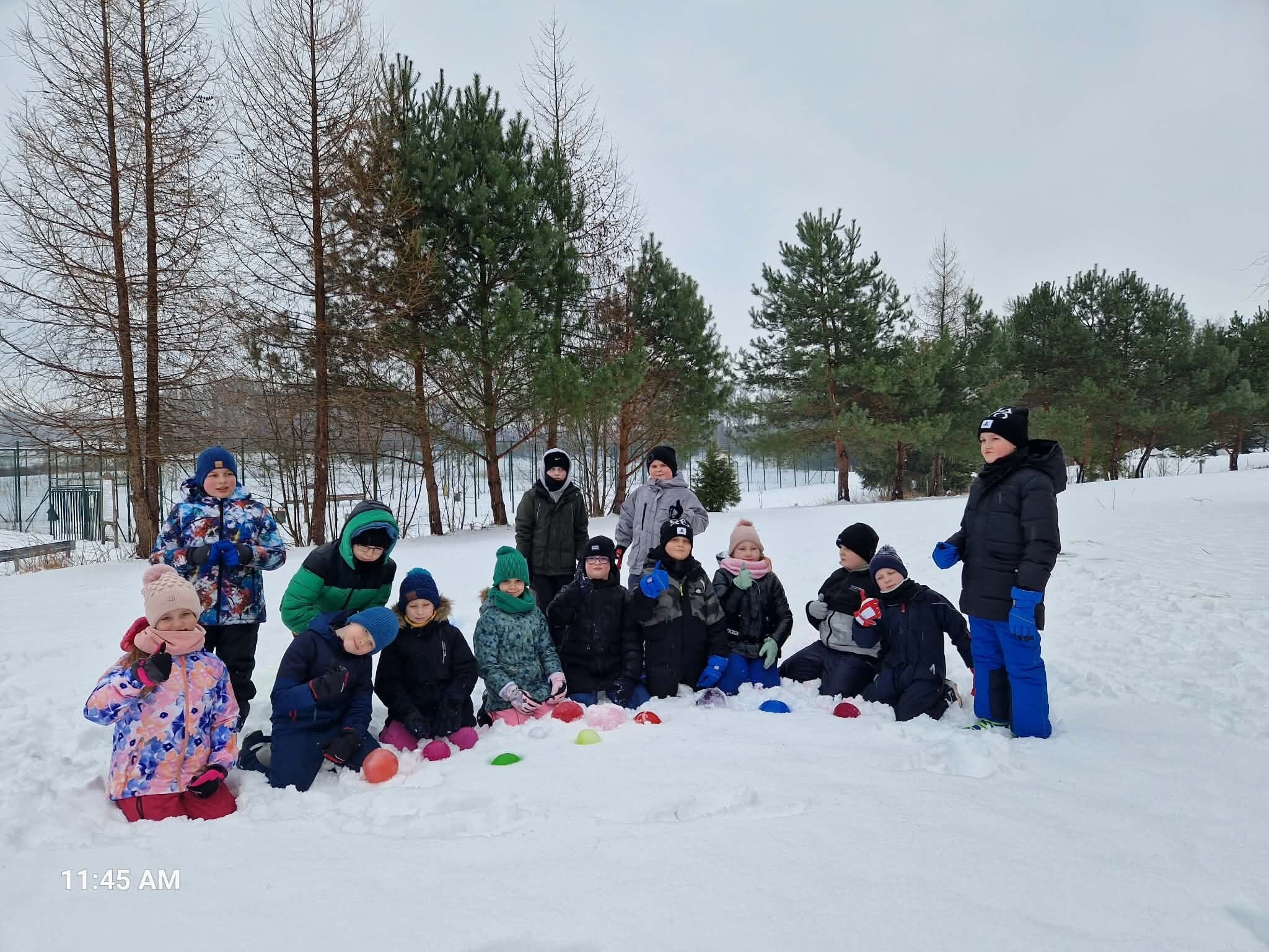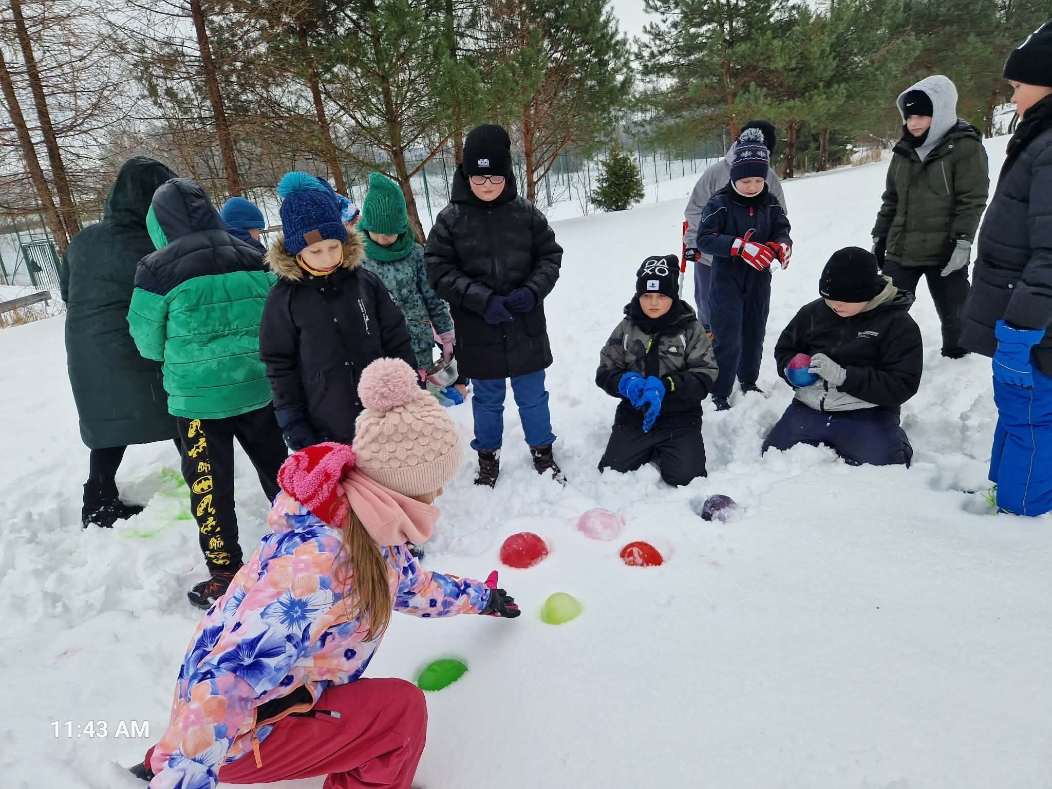 Uczniowie klasy IIIB, korzystając z zimowej aury, wykonali eksperyment z kulami lodowymi. Zabarwiliśmy wodę, wlaliśmy do balonów i zamroziliśmy. Dzisiaj nasze kolorowe kule uwolniliśmy z balona i umieściliśmy w śniegu. Zobaczymy, co się z nimi dalej stanie. Czy wytrzymają do "po feriach"? W jakim będą stanie: ciepłym, skupionym czy gazowym.? Czekamy na wyniki.