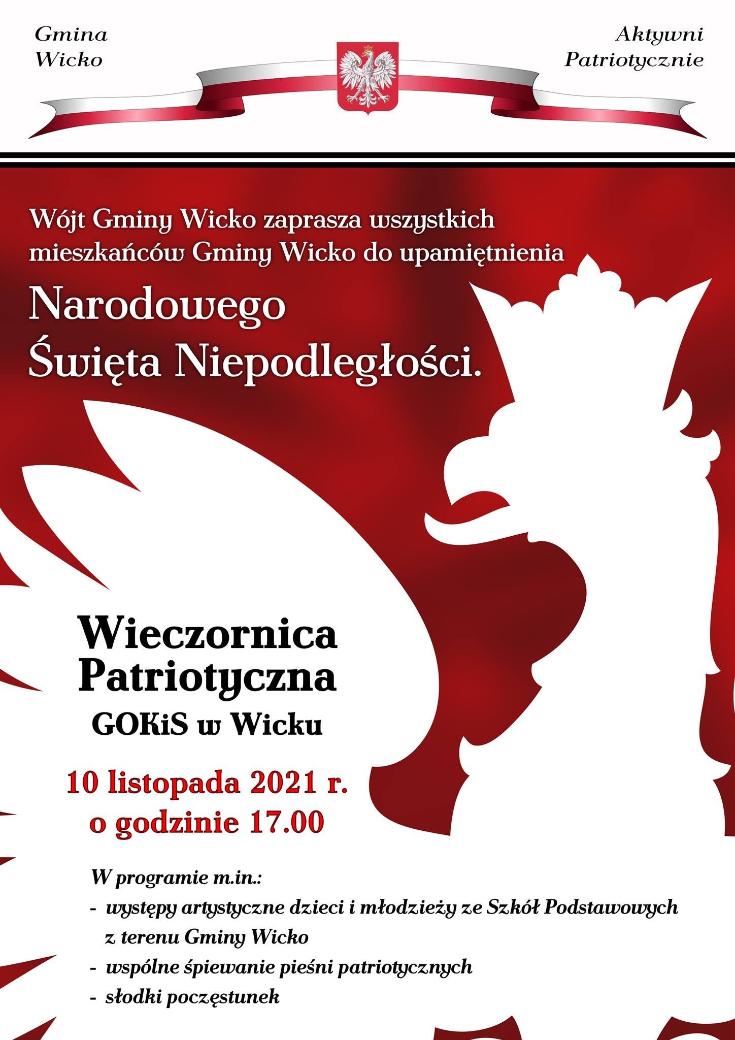 Wójt Gminy Wicko zaprasza wszystkich mieszkańców Gminy Wicko na Wieczornicę Patriotyczną w celu upamiętnienia Narodowego Święta Niepodległości, która odbędzie się 10 listopada o godzinie 17.00 w miejscowym GOKiS-ie. W programie artystycznym wezmą aktywny udział także nasi utalentowani uczniowie pod kierunkiem Pani Joanny Jagodzińskiej oraz Pana Piotra Neumüllera. Usłyszymy także występ naszego szkolnego chóru, przygotowany pod kierunkiem Pani Nataszy Konopackiej. Do zobaczenia w najbliższą środę!